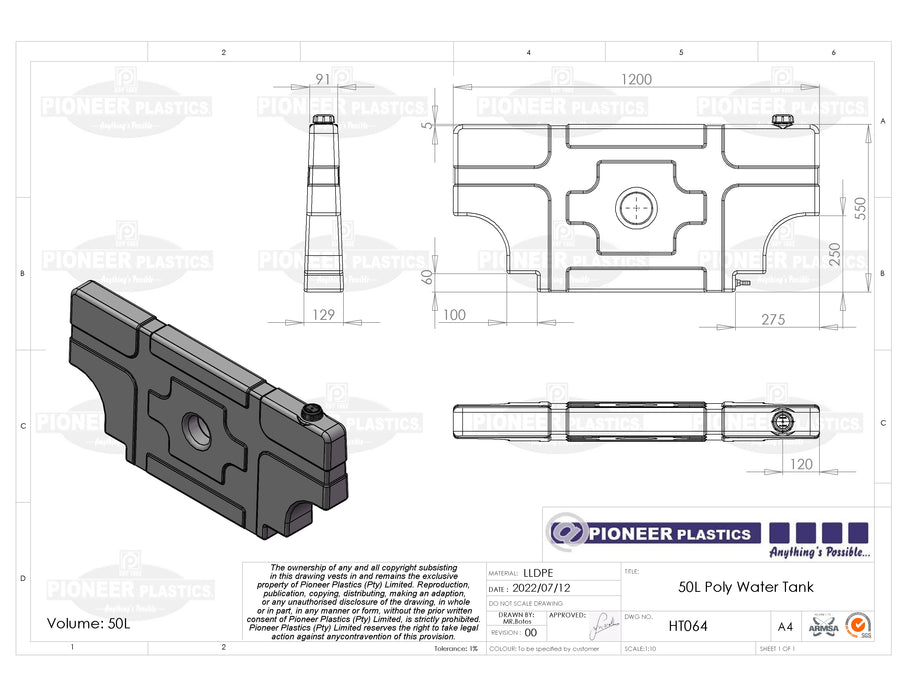 This 50L poly tank is cleverly shaped to sit over your bakkies wheel arches, featuring a recessed spot for the outlet fitting. Made from tough, UV-resistant polyethylene and BPA free, it’s ready to team up with the Pioneer Water Hose Kit for all your water adventures!