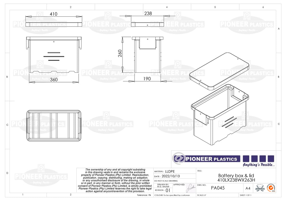 The Battery Box is made from Virgin UV Stabalised Material and is a robust storage solution for batteries in boats, cars, homes as well many other applications. The boxes are usually made in black but for quantity orders the boxes can be made in a wide range of standard colours.