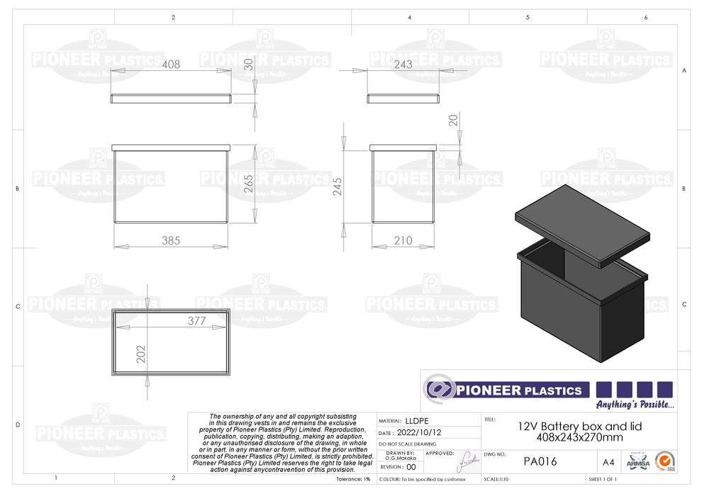 Crafted from Virgin UV Stabilised Material, this Battery Box offers a tough and reliable home for your batteries—whether they're powering boats, cars, or your latest DIY project. Usually rocking a sleek black look, but order in bulk and you can mix it up with a variety of colors to brighten your battery’s day!